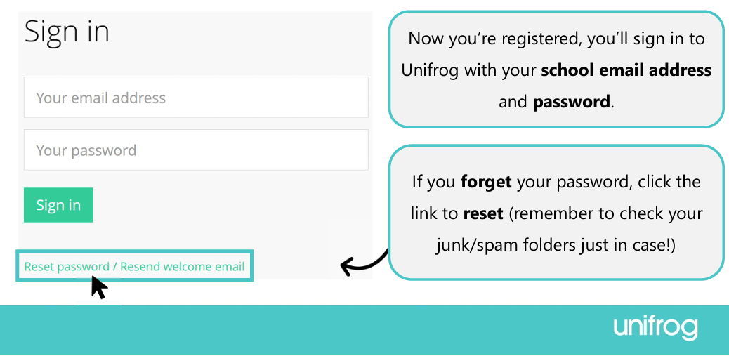 - Go to your school email account and follow the instructions that Unifrog send to you to reset your password