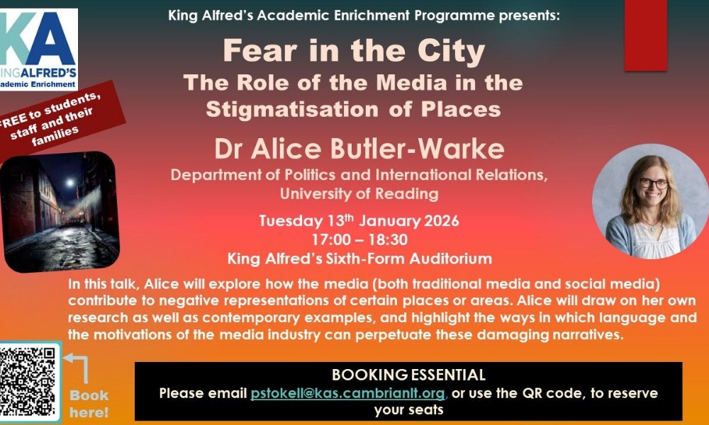 In this talk, Alice will explore how the media (both traditional media and social media) contribute to negative representations of certain places or areas. Alice will draw on her own research as well as contemporary examples, and highlight the ways in which language and the motivations of the media industry can perpetuate these damaging narratives. This particular talk will invite you to engage in some critical thinking regarding motives and biases.